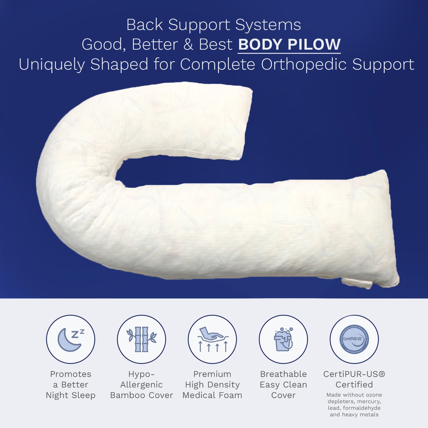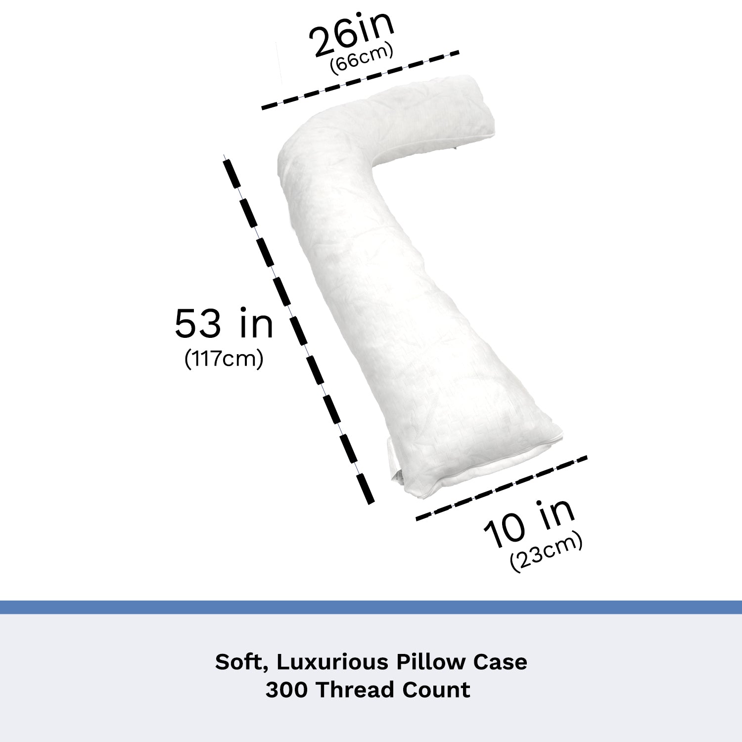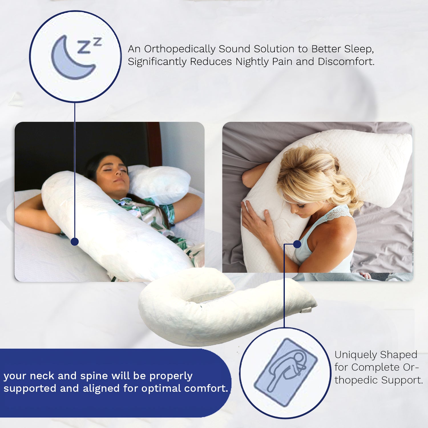 Designed in a unique “J” shape that replaces multiple pillows, offering targeted support to your neck, shoulders, back, and hips for total body alignment. -
